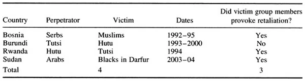 Based on available evidence, four cases from 1990–2004 clearly satisfy the definition above, as listed in Table 2.8 Three of the four cases (75%)—Bosnia, Rwanda and Sudan (Darfur)—fit the pattern in which members of the victim group provoked the group’s demise by violently rebelling. Burundi does not fit, because the ruling Tutsi perpetrated genocidal violence in response to a peaceful challenge to their authority, the election of the state’s first Hutu president in 1993, rather than to a violent rebellion.9