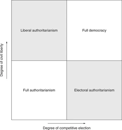 Under liberal authoritarianism, while civil liberties are to a large extent respected and the activities of interest groups and opposition parties are generally recognized, popular election for the national chief executive is absent and opposition forcesâ access to government power are basically denied. In contrast, under electoral authoritarianism there are regular multiparty elections for the national chief executive operated on the basis of universal suffrage, but civil liberties are largely suppressed by the government in order to prevent the opposition forces from mobilizing against the authoritarian incumbents and endangering its continued hegemony (Case, 1996, 2008; OâDonnell & Schmitter, 1986). This scheme of classification results in the fourfold typology shown in Figure 1.1, which broadly captures the four ideal types of political regimes that can be found in contemporary societies.