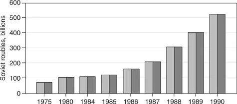 Figure 1.2 USSR internal debt, Soviet roubles billions (1975â1990) (source: authorâs calculations based on data from Shatalin et al. (1990)).