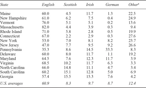 Table 1.1 Percentage distribution of the white population of the United States by nationality and state from the 1790 census (%)