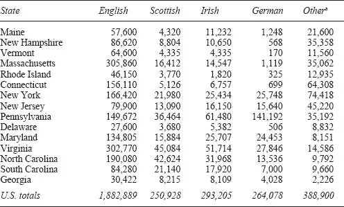 America as a melting pot of nations began in the colonial period. While traces of many nationalities can be found, the dominant group among European-Americans of non-English-speaking ancestry were the Germans. Table 1.1 presents the percentage distribution of the white population of the United States by ethnicity and state from the 1790 census—the first U.S. Federal census. While the accuracy of the ethnic designators in this census has been disputed, the general magnitudes and their relative patterns are still informative.2 Nothing as comprehensive exists for the colonial period.