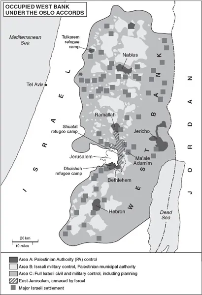 Dheisheh refugee camp lies to the south of Bethlehem within Area A, under the jurisdiction of the Palestinian Authority (PA). Areas A, B and C are administrative divisions that emerged from the Oslo negotiations. Under its provisions, Area A, which includes Palestinian built-up areas in the West Bank (excluding Jerusalem), is under PA jurisdiction for both civilian matters and policing. In Area B, which comprises most of the agricultural lands around Palestinian villages, the PA is responsible for civilian affairs and the Israeli army deals with policing. In Area C, which amounts to over 60 per cent of the West Bank (excluding Jerusalem), Israel is responsible for both law enforcement and civilian affairs of Palestinians, and for the Israeli settlements. Areas A and B are not contiguous (see Figure 1.1 for the different areas). The camp lies on one side of the main road from Bethlehem to Hebron. The shops that lie on the main road are frequented by people from Bethlehem who are not refugees, and so the camp is integrated into the economy of the town. Refugees who could afford to do so have moved out of the camp into homes on the other side of the main road, in a new neighbourhood called Doha. This has alleviated the overcrowding that plagues other refugee camps. Up to 13,000 people are registered as refugees with Dheishehâs UNRWA office. Not all live in the camp but they can use UNRWA facilities such as schools, which are chronically short of places.