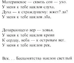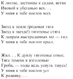 In this poem Tsvetaeva uses the word “naklon” in a neologistic, lexically transgressive way. In standard usage, “naklon” designates a physical, technical, or mathematical “incline”, “slope”, or “bent”, such as the incline of a head or an angle. Tsvetaeva, however, gives “naklon” a variant metaphoric meaning as if it were the etymologically related abstract noun, “sklonnost”‘ (inclination, predilection, bent). Her lexical variance has the effect of heightening the physicality and emotional intensity of the speaker’s erotic incline towards her addressee, making her bent towards him seem much stronger than the ordinary human inclination of one person for another. The poem “A Bent” illustrates that the typical Tsvetaevan subject’s feeling of strong attraction to another person often puts her fundamentally at variance with standard usage and convention. Therefore, her experience of desire is necessarily isolating, painful, and quite literally, ecstatic, out of her self, “a miracle of the strange there becoming here”, of the strange bent becoming her own inclination.
