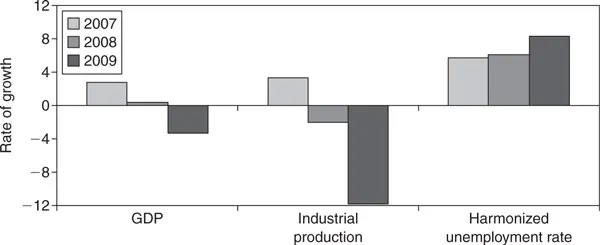 It took just a few months for the crisis to spread from Wall Street to Main Street, with huge effects on the real side of the economy. In OECD countries (Figure 1.1), the change in gross domestic product (GDP) shows a modest 0.31 per cent rise in 2008 and a fall equal to −3.41 per cent in 2009; similarly, industrial production plunged by −11.46 per cent in 2009 while unemployment rose considerably, with a 43 per cent increase in the harmonised unemployment rate in the three-year period from 2007 to 2009.