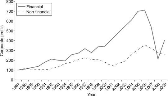 Figure 1.3 Corporate profits, financial and non-financial corporations, 1987–2009 (base year = 1987), US (source: authors’ elaboration on Bureau of Economic Analysis National Income and Product Account).