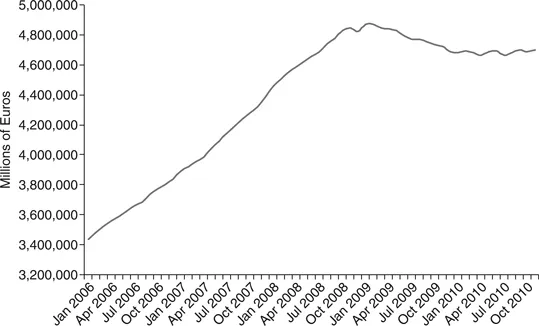 Figure 1.4 Loans to non-financial corporations: outstanding amounts at the end of each period (stocks), Eurozone, 2006–2010 (millions of euros) (source: European Central Bank).