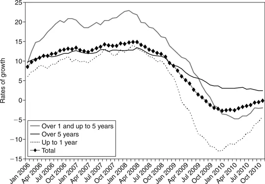 Those who advocate that the crisis originated in the financial system argue that it spread to the real sector of the economy as a result of a credit crunch. The credit crunch reflects a situation in which the financial and banking system reduces the availability of credit for internal reasons that do not directly depend upon demand conditions and monetary policy. Figure 1.4 shows the total value of loans to non-financial corporations, for the period 2006–2010, aggregated for the Eurozone. Across the Eurozone, a generalized reduction in loans has occurred in the business sector, equal to a −3.8 per cent drop from the peak of January 2009. Figure 1.5 displays the rate of growth of loans to non-financial companies for different periods of maturity. It reveals that short-term loans have been the most affected, followed by mid-term loans, while the rates of growth of long-term loans have been positive following a substantial plunge. In order to support the financial nature of the current crisis, the key question is whether these trends are the causes or the results of the depression.