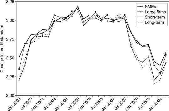 Figure 1.6 Response to the question: ‘Over the past three months, how have your bank’s credit standards changed as applied to the approval of loans or credit lines to enterprises?’ (source: Survey on the Access to Finance of SMEs in the Euro Area, European Central Bank, 2010).