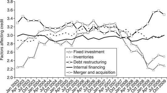 One way to seek to corroborate this hypothesis is to look at qualitative data on the relationship between the banking system and the business sector concerning the conditions of credit. In this regard, a relevant source is the Survey on the Access to Finance of SMEs in the Euro Area, carried out by the European Central Bank (ECB) every six months in the Eurozone.3 Figure 1.6 shows the average response to the following question put to the bank: ‘Over the past three months, how have your bank’s credit standards as applied to the approval of loans or credit lines to enterprises changed?’ Responses ranged from 1 (tightened considerably) to 5 (eased considerably). It is easy to see that a remarkable tightening occurred, starting in the summer of 2007, with a recovery beginning at the start 2009. This was particularly the case regarding long-term credit and large firms. Figure 1.7 shows the response to the following question: ‘Over the past three months, how have the following factors affected the demand for loans or credit lines to enterprises?’ Responses ranged from 1 (low) to 5 (high). Starting in the autumn of 2007, there was a sharp plunge in the role played by fixed investment and merger and acquisition activity. At the same time, the demand for loans has been increasingly affected by the need of restructuring the debt.