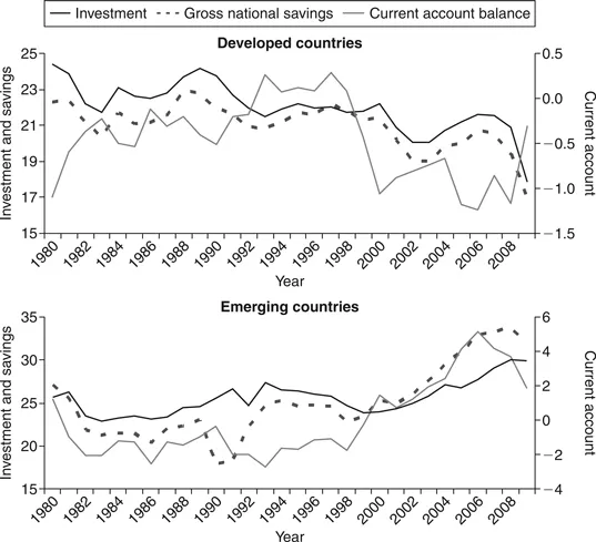 Figure 1.8 Investment, gross national savings and current account balance (rates of growth), 1980–2008: developed and emerging countries (source: authors’ elaboration on IMF, World Economic Outlook database).