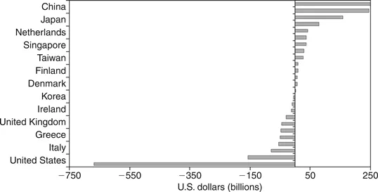 Figure 1.9 Current account in billions of US dollars, 2008 (selected countries) (source: authors’ elaboration on IMF World Economic Outlook database).
