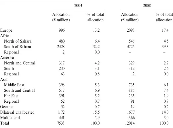 TABLE 1. Regional distribution of aid commitments to developing countries (ODA), 2004 and 2008