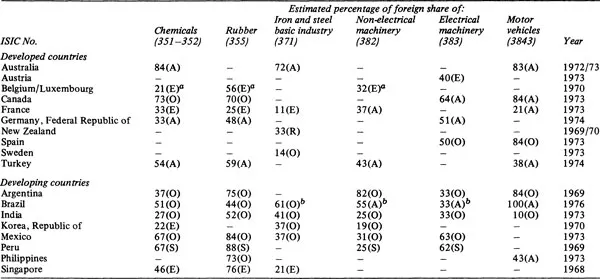 To many host countries, the contribution of affiliates of MNEs is a crucial one. In several economies, such affiliates account for more than one-third of the output of the manufacturing sector and/or one-half the output of their primary product industries. Examples include Australia, Belgium, Canada, Ireland, Norway and Sweden among the developed countries; Brazil, the Dominican Republic, Ethiopia, Fiji, Ghana, Honduras, Kenya, Malaysia, Mexico, Nigeria, Peru, the Philippines, Sierra Leone, Singapore, and Turkey among the less developed nations. The concentration of activity is most marked in import-substitution or export-oriented sectors supplying primary commodities, branded manufactured goods and skill-intensive services, and in which the market structure is oligopolistic. Some details published by the United Nations Centre on Transnational Corporations in 1978 are set out in Table 1.2.