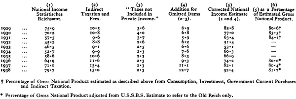 There is a further check on this. The chief peculiarity of the Statistisches Reichsamtâs estimates of national income referred to above is that they deliberately exclude certain goods and services bought by the public authorities for purposes which are regarded as essential to the maintenance of the national income as a wholeâe.g., purchases for road-maintenance, general administration, fire-brigades, police, and (according to the official statement in the Reichsamtâs Sonderheft Nr. 24 of 1933) defence. Now, it is clear that the last item has never been omitted in toloâsince the late 1920âs, at leastâbut much has undoubtedly been omitted which is included according to British and United States practice, and which it is not possible to estimate by a study of budgetary data alone. Mr. Colin Clark (in The Conditions of Economic Progress) recognised the nature of the problem, but the corrections which he applied in order to make the German national income statistics accord with his own definition were certainly far too low.