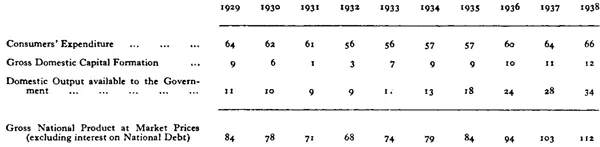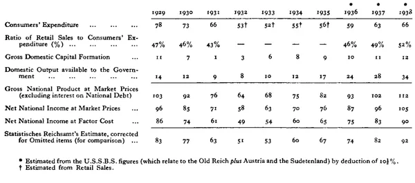 What the changes under discussion amounted to in real termsâi.e., if measured at constant pricesâis roughly indicated in Table III. This suggests that the real national product of Germany fell by not far short of 20 per cent. in the course of the depression after 1929, regained its 1929 level by 1935 (as did that of the United Kingdom also), and by 1938 had risen some 33 per cent. above the 1929 peak. Consumption, however, both fell less and rose more slowly ; the decline from 1929 to 1932 or 1933 seems to have been only some 12 or 13 per cent. ; the 1929 level was, however, not surpassed until 1938. (It is perhaps worthy of note that the Reichskreditgesellschaft in 1939 declared that real consumption in the previous year had passed the 1929 level.) The population had, meanwhile, increased by about 5 per cent., so that the slight excess of total consumption in 1938 above the 1929 level, which these figures indicate, can hardly have meant any appreciable net increase in real consumption per head. The one-third increase of the German national product of 1938 above the pre-Nazi peak level was made up mainly of the Stateâs share (which had trebled), and, as for the remainder, of a one-third increase in gross capital formation. The consumer had no share in the enjoyment of it, though he had regained the ground previously lost in the depression after 1929. The increase in output was, of course, largely associated with an increase in employment and a diminution of unemployment. The latter had been very heavy, exceeding 51/2 million in 1932 ; by 1936 it was down to a level of 11/2 million which, having regard to the size of Germanyâs occupied population, appears at first sight to indicate a nearer approach to full employment than was attained in the United Kingdom in any year of the pre-war decade. The improvement is to some extent illusory, since, after 1933, those in labour camps were excluded from the statistics of unemployment ; and the expansion of the armed forces in any case created a situation which it is hard to compare with that in the United Kingdom. Nevertheless, the great bulk of those formerly unemployed had found normal employment by 1936, by which year, also, total employment in mining and industry seems (from the rather inadequate sample data available) to have regained the 1929 level, i.e., to have recovered from the 40 per cent. fall which had taken place (according to these same data) in the depression. It is noteworthy that the Institut fĂźr Konjunkturforschung Index of Industrial Production fell by no less than 42 per cent. between 1929 and 1932âa piece of evidence which helps to render this great fall in employment more credibleâand that, by 1936, it stood some 6 per cent. above the 1929 level ; an increase which, again, accords fairly well with the regaining of the 1929 employment level and a moderate rate of technical progress, or with the 12 per cent. increase in total real income.
