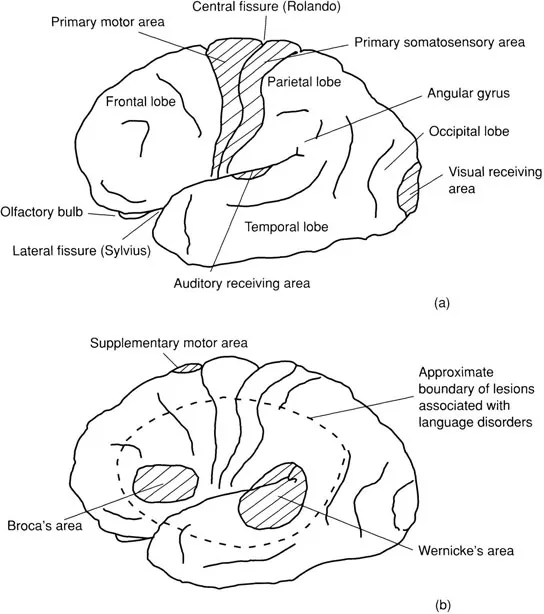 Figure 1.1 | (a) Human cerebral cortex, lateral view; (b) language associated cortex. |