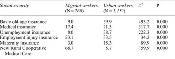The more important difference between the treatment of migrant workers and urban workers lies in social security (see Table 1.3). For example, in terms of old-age insurance, 9 percent of migrant workers have access to basic old-age insurance, while the figure is 59.9 percent for urban workers; the percentage of migrant workers who enjoy medical insurance for workers or residents is 17.4 percent, while the figure is 71.3 percent for urban workers; 8 percent of migrant workers are covered by unemployment insurance, while only 38.7 percent of urban workers are; the gap of employment injury insurance between migrant workers and urban workers is smaller: 23.1 and 33.5 percent, respectively.6