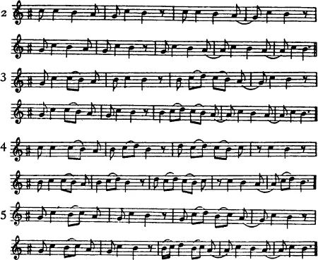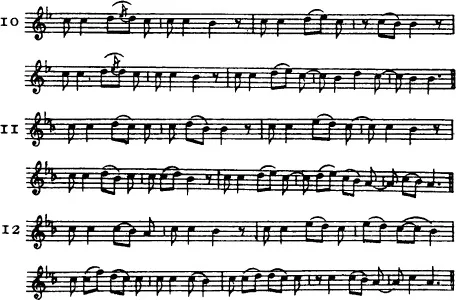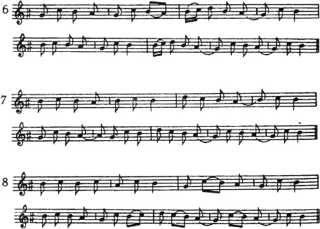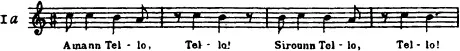 le chĆur le rĂ©pĂ©ta; la coryphĂ©e chanta la deuxiĂšme partie de la chanson et le deuxiĂšme vers du refrain, avec une petite addition :Aux 6me, 7me et 8me formes la mesure changea, car le mouvement de la danse sâĂ©tait accĂ©lĂ©rĂ©. Au moment oĂč la 8me forme Ă©tait chantĂ©e, un deuxiĂšme groupe entra dans la danse, au cours mĂȘme du chant. Une nouvelle coryphĂ©e passa Ă la tĂȘte de la danse. Se font coryphĂ©es les jeunes filles ou les garçons douĂ©s dâune belle voix et connus pour leur talent de chanter; quand une de ces coryphĂ©es sâavance, la prĂ©cĂ©dente lui cĂšde la place et se tient Ă sa gauche.