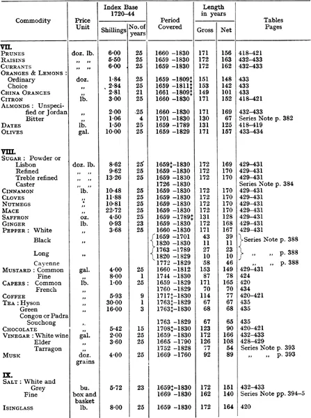 While prices are given in the tables for most commodities from 1659 to 1830, there are two dates in this period at which changes in the methods of supply or the records affect the comparability of the prices before and after. At the beginning of the new reign in 1760, financial provision for the Royal Household was placed on a new basis under the statute 1 G. III, c. 1 ; the accompanying changes in methods of supply to the Household included changes in the class of purveyors, in the period of supply, and in allowances for carriage as well as abolition of fees previously charged to the purveyors. After the beginning of the Regency, the bulk of the supplies in London (after May 1811) are for Carlton House, at rates in some eases much above those for other palaces. At or about each of these two dates accordinglyâ1760 and 1811âa half-line is drawn where necessary across the tables ; the degree to which comparability of the prices before and after is affected at these dates is not the same for all commodities and must be considered for each of them in the light of the information given below and in the series notes.