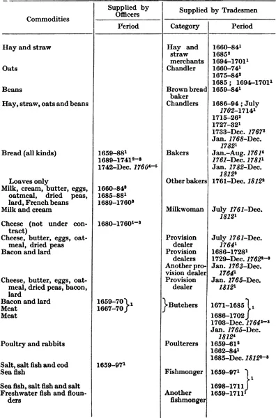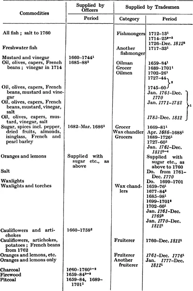 The table below shows for each commodity the class, description and number of purveyors at each period from the Restoration to the end of 1812. It will be seen that a few articles were supplied by tradesmen direct throughout the period while others were transferred from officers to tradesmen during the period. In the case of oil, olives, capers, French beans and vinegar, 1685â88, there occurred a reverse transference from tradesmen to officers. The officers holding contracts were mainly those connected with the Bakehouse, Buttery, Spicery, Kitchen and Wood-yard. From January 1761 all contracts are with tradesmen and none with officers of the Household.