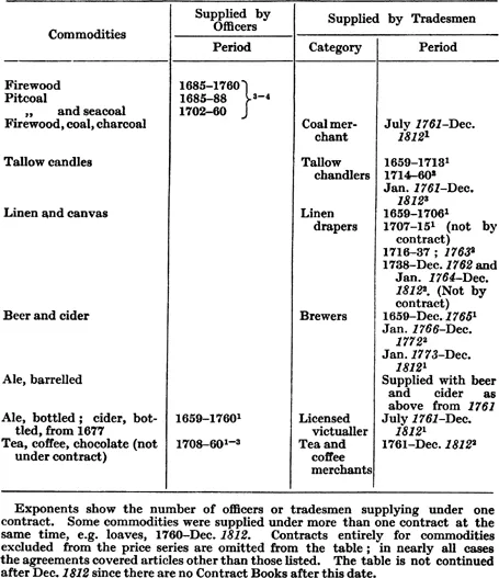 Prices tabulated are taken from the contracts entered in the Board of Greencloth Records1 1659â68 and in Contract Books from 1669 together with the Comptrollerâs accounts, detailing monthly incidental expenses, and the Extraordinary Creditorsâ Books.2 From 1760 the Creditorsâ Books, containing copies of tradesmenâs monthly bills covered by ordinary expenditure, have been used in preference to Contract Books, since they record actual deliveries.3 Bills for drink, foodstuffs not requiring cooking, lights and fuel were included under Household Creditors ; foodstuffs to be cooked came under Kitchen Creditors and linen, utensils, stationery, china, cutlery and glass under Incidental Creditors. From 1812 no contract books are available and the method of supply is uncertain.