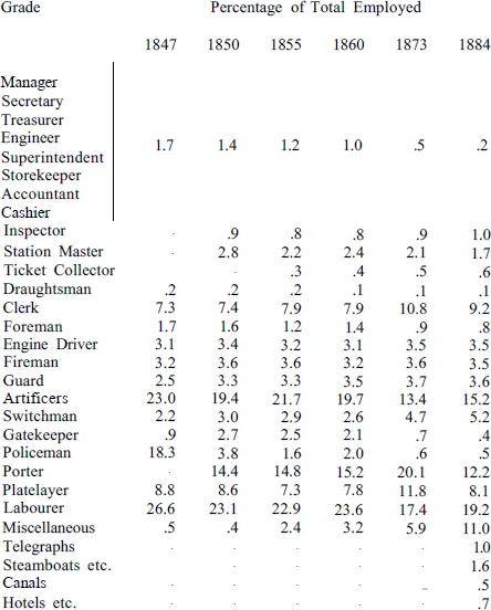 An analysis of labour employed, by the chief grades, as shown in Table II gives a preliminary idea of the problem and of the numerous types of occupation which had to be filled. The grades may be put into seven main groups: managerial, clerical, supervisory, skilled operating, unskilled, artificers, and miscellaneous. This is shown in Table III. Managerial includes managers, secretaries, enoirieers, accountants, storekeepers. Supervisory includes station masters, inspectors and foremen. Skilled includes engine drivers, guards and switchmen. Unskilled includes all others except artificers and miscellaneous. The division between skilled and unskilled has been made on the basis of the training and experience required, responsibility and wages. The figures for 1847 are incomplete and not strictly comparable with others. The low supervisory percentage in that year is accounted for by the fact that there are no figures for station masters and inspectors.
