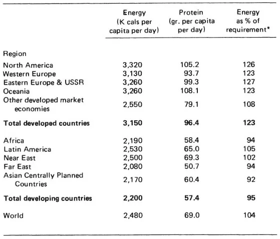 The average energy intake in the developed countries during 1969â71 was 23 per cent more than the requirement,11 while that in the developing countries was 5 per cent less than the requirement. The deficiency in the Far East (including the centrally planned economies) and Africa varied between 6 and 8 per cent. On a world level the protein situation was more satisfactory than is usually thought. According to the currently prevailing views on nutrition 40 to 50 grammes of protein per capita per day is quite adequate for an adult. On this standard the developed regions have been eating twice as much (or even more) than they require. Even the developing regions seem to have enough protein on average levels of intake. But in those cases where the intake of energy is less than the requirement, some of the protein is used up in meeting the energy gap.12 As such it is not easy to say whether the intake of protein in these countries is adequate, even though the figures may indicate this.