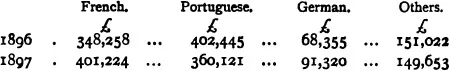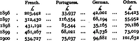 The general conclusions to be drawn from a study of these figures are various. First and foremost there is the clearly established fact that British trade with West Africa is expanding enormously and has almost unlimited prospects before it, now that serious and concentrated efforts are being made on all sides to open up the untapped wealth of the interior by the means of roads and railways and by the improvement of navigable waterways, while the cessation of intertribal warfare in many districts must entail a large increase in the population, and therefore, in the native capacity for production and purchase. It is also demonstrated that every year West Africa absorbs a larger quantity of British manufactured goods: that the exports of British manufactured goods are steadily increasing to British West Africa and increasing to an extraordinary degree to the possessions of Foreign Powers in West Africa, especially to the French possessions: that Great Britain is consolidating her hold upon the carrying trade of West Africa as testified by the increased quantity of foreign and colonial manufactures shipped to West Africa from British ports: that the ContinentâGermany6 chieflyâis receiving a greater amount of raw produce from the British possessions in West Africa, a deduction which can be fairly drawn from the stationary aspect of the importation by Great Britain of such produce from her own West African possessions. And the final conclusion is this, that, in view of the restricted extent of the British possessions in West Africa, compared with the possessions of Foreign Powers in that part of the world, the latter offer a very much vaster field for the sale of British goods. Consequently, it is the bounden duty of the British Government and the British Chambers of Commerce, while in no way neglecting the brilliant possibilities which the British West African possessions offer under wise administration for the enterprise of Englishmen, to be ever on the alert to look to the future and to protect British trade with the possessions of the Foreign Powers in West Africa against legislation tending to close the door of those possessions against it; and to insist that, whenever international treaties guaranteeing freedom of trade to the subjects of all nations exist in West Africa, they shall be rigidly adhered to by the signatories. In this respect British diplomacy has shown itself singularly lax. But the mischief already committed may even yet be remedied, and further dangers which loom ahead averted, if the British public will only realise before it is too late the enormous issues at stake.