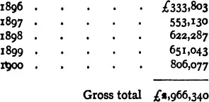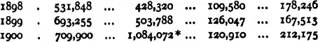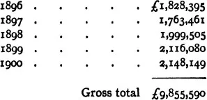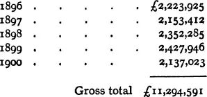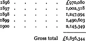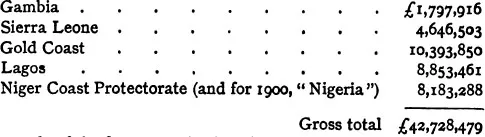 The trade of the former territories of the Niger Company, from 1896 to 1899 inclusive, is not reckoned in this total, no public figures being available.