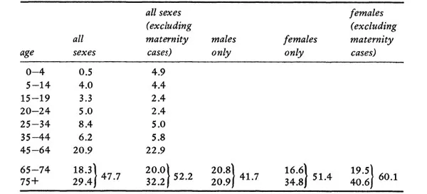 An analysis of the usage of English hospital beds in 1972 gives some indication of the type of conditions doctors are now called upon to treat. Table 1, for example, shows how 30 per cent of all beds in non-psychiatric hospitals are taken up by individuals aged over seventy-five and that 50 per cent of all beds are taken up by individuals over sixty-five. If we look at female patients alone, and exclude those in hospital for maternity care, we find that nearly two thirds of all beds are taken up by individuals over sixty-five. The conditions that these older age groups suffer from are very largely of the degenerative chronic type – quite different to the acute, life-threatening disease of the past.