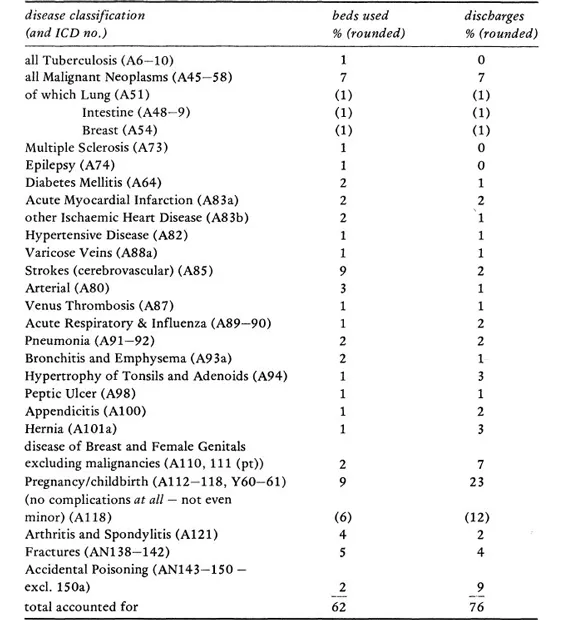 The department of Health’s Hospital In-Patient Enquiry (1974b) provides details of a bed-census carried out in all English non-psychiatric hospitals in 1972. Table 2 provides information on the most frequent diagnoses given on patients in hospital in 1972. The left-hand column gives a picture of the hospital population at any one moment – the individuals you could encounter in a walk around hospitals on an average day – and the right-hand column shows the number of discharges or deaths. Where there are differences these reflect the length of stay required for different conditions. From the table it can be seen that the major categories in terms of bed occupancy are: malignant neoplasus (7 per cent); strokes (9 per cent); arterial disease (3 per cent); childbirth (9 per cent); arthritis (4 per cent); and fractures (5 per cent). The great majority of these conditions are ones which have long-term implications for treatment and management. Infectious diseases, it will be noted, hardly figure at all.