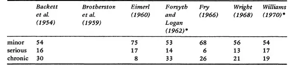 The picture is even more clear in general practice. The average general practitioner with 2,500 patients on his list will spend between 6–17 percent of his time dealing with acutely ‘serious’ disease of a life-threatening variety. He will spend somewhere between 51/77 per cent of his time treating ‘minor’ diseases and between 8–30 per cent of his time managing ‘chronic’ complaints (Backett et al., 1954; Brotherston et al., 1959; Eimerl, 1960; Fry, 1966; Wright, 1968; Williams, 1970). The types of disease that the general practitioner sees in the various categories are set out in Tables 3–6.