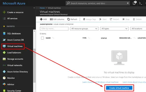 Virtual machineslink on the dashboard, and a right panel would open where you see all your VM’s. Since we are creating new and we do not have existing ones, so it would be blank. Click onCreate virtual machine:
