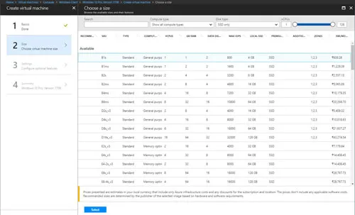 OK, you get to see the second section to choose the size of the machine where you see the list of RAMs, Hard disk size, SKU, and zones. Each configuration has a cost associated with it, so choose as per your need and budget. For training/tutorial purposes, I am choosing the first one that has the minimum cost as shown in the following screenshot: