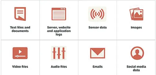 Unstructured data requires advance tools and softwareās to access information. For Example, images and graphics, pdf files, word document, audio, video, emails, PowerPoint presentations, webpages and web contents, wikis, streaming data, location coordinates etc fall under the unstructured data category. Unstructured data represent around 80% of the data. Following image shows various unstructured data types.