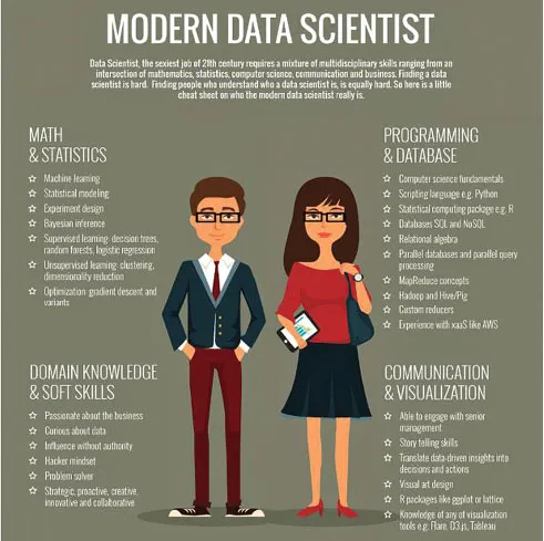 Data Science is a field that extract the knowledge and insights from the raw data. To do so it uses Maths, Statistics, Computer Science and Programming Language knowledge. A person who has all these skills is known as a Data Scientist. Data scientist is all about being curious, self-driven, and passionate about finding answers. The following picture shows the skills a modern data scientist should have!