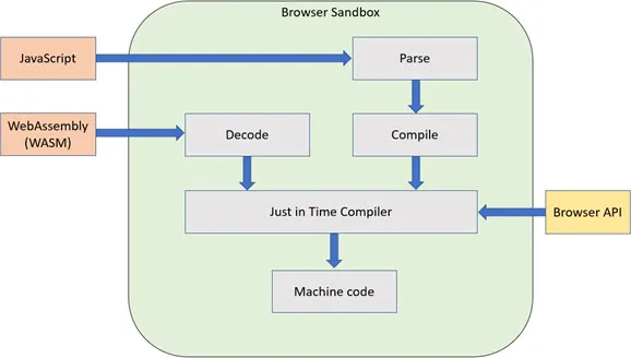 When JavaScript code gets executed, first goes through the process of parsing and compilation, and then, the Just in Time (JIT) compiler performs speculative execution of binary code. The WebAssembly modules are compiled in a higher-level language, and they are already parsed and compiled, so they go through a decoding phase before executed by JIT. Typical execution of JavaScript and WebAssembly in browser sandboxas shown in the following Figure 1.1: JavaScript and WebAssembly execution in Browser sandbox:
