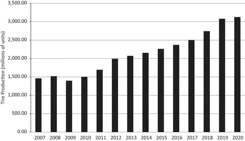 The global tire industry has shown remarkable growth, reflecting the growing global economy and the corresponding increase in standards of living. Discounting the impact of the pandemic due to COVID-19, in the year 2020, total global tire production had been expected to exceed three billion units. Though there is considerable variation in researcher’s estimates for both previous and future production, regardless of the source, the growth of the tire industry has been largely linear over time, with an anticipated minor dip in 2021 and 2022, and then a return to historic linear growth rates from 2023 onwards (1–3). Other than a dip in 2009, the raw materials supply base for the industry has shown similar growth rates and is expected to exceed $110 billion by 2024, illustrating the impact of the industry on global economic growth (4).