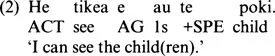 In sentences with verbs of sensing the object is zero marked and the subject is marked by the agentive particle e. The association of the agent marker with the subject of verbs of sensing is probably to be explained by the fact that the two common verbs of this category: tikea – ‘see’ and ŋaro’a – ‘hear, smell’ are, historically, reflexes of passive forms [PPN – C((c)i)a] with which the particle would have been a marker of the oblique subject (V. Krupa, personal communication).