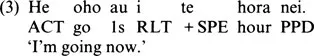 Positive orders and obligations are expressed in a variety of ways. Obligations are signalled by prepositive e, the marker of ‘state’, sometimes reinforced with the benefactive particle mo/ma; an unfulfilled obligation is marked by fronted S preceded by a and the past tense with the particle i. The ‘imperative’ is signalled by the prepositive verbal particles ka and ki which also serve to express momentary/contiguous actions.