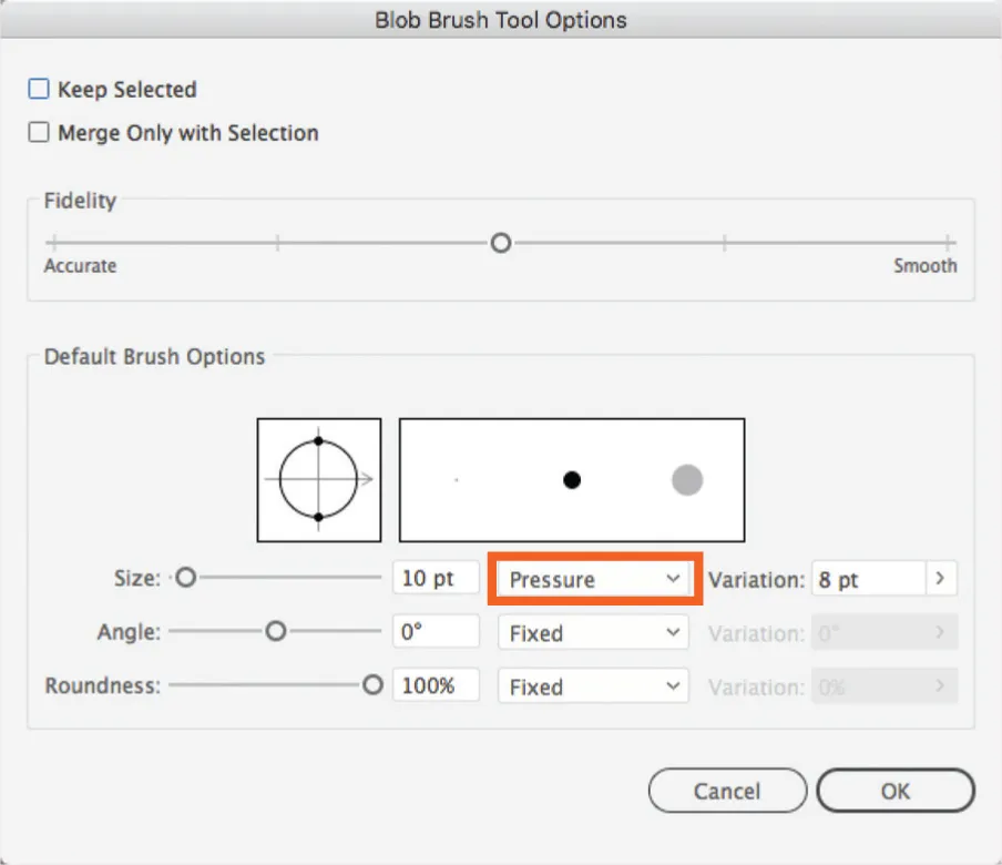 | Although the Blob Brush creates objects or shapes with a fill and no stroke, it actually takes the colour for the fill counterintuitively from the stroke setting in the Toolbar. When drawing with the Blob Brush tool, new paths merge with the topmost path of an object encountered of the same colour. If the new path touches more than one matching path on the same layer, then all of the intersecting paths are merged together. Blob Brush will also merge with paths created by other tools if those objects have no stroke and have the same fill as the Blob Brush. By double-clicking on the tool button you can access the options on the tool. Good results are often produced by a close fidelity setting for following your pen movements but a high variation in width setting based on pen pressure. Because Blob Brush can produce quite soft ink- and paint-like marks without adding any extra colours it is well suited to textiles and fashion design. | |