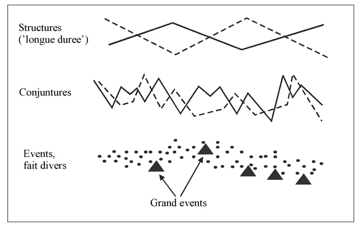 Third, historians have learned to distinguish between different types of chronologies. Braudel (1958; 1976) identified three types based on different time scales and different speeds: a) structural history, associated with the study of geological, geographic, social, and mental structures that change only glacially; b) conjunctural history, associated with the study of economic and demographic cycles with durations of decades rather than centuries; and c) eventful history, associated with the ephemera of politics and events reported in newspapers (Figure I.1.1).