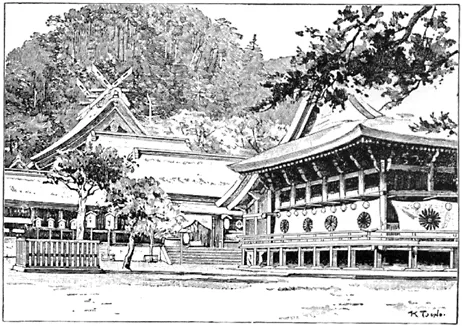 ACCORDING to the legend, the Japanese islands were created by the god Izanagi-no-Mikoto and his wife Izanami-no-Mikoto. Their daughter, Amaterasu-Omikami,1 the sun goddess, was charitable, virtuous and clever; she taught men to cultivate the earth, to obtain silk and weave it in the loom. Her brother, Susa-noo-no-Mikoto, in contrast to her, was cruel and fierce. Therefore he was banished from Heaven to Izumo, a province on the island of Honto.2 He built a house there, and married a beautiful girl who bore him a son named Okuninushi-no-Mikoto. He was kind, clever and brave; he defeated all the frontier tribes and encouraged agriculture. When Amaterasu-Omikami sent an ambassador to demand the whole of his kingdom, he obeyed, and at once delivered up the land. He withdrew to the village of Kizuki in the province of Izumo and dwelt there till the end of his days, There is a large temple, Izumo-no-