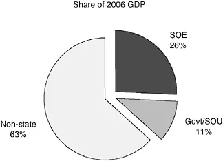 The estimates in Figure 1.2 show that state administrative units (such as the civil service, healthcare, science and education) accounted for some 11 per cent of 2006 GDP. State-owned and state-controlled firms in all sectors made up another 26 per cent of Chinese value-added and ānon-stateā ownership, as defined in the previous section, accounted for the remaining 63 per cent. In other words, on an ownership basis, the state now accounts for around 30 per cent of all (non-administrative) commercial activity in China.