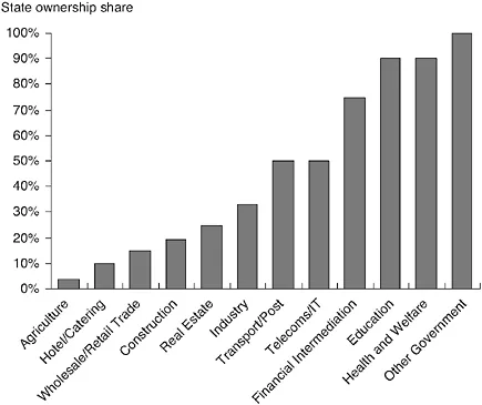 How were these estimates obtained? By beginning with official data for GDP by industry, and then using available statistics for state ownership in each productive sector. Figures are directly available for agriculture, manufacturing and construction; for the various services sectors partial data are used to generate the above calculations. As you can see from Figure 1.3, the state is virtually