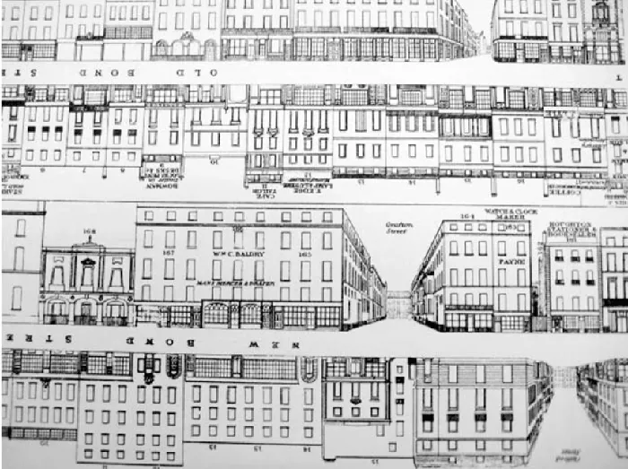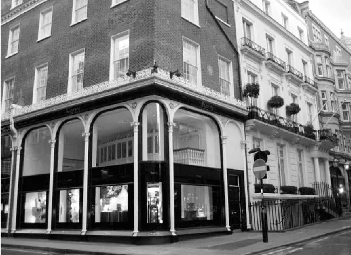 Walk to the same corner today and you will find one of the most glittering retail precincts in London, filled with high-end jewelry stores, their sparkling wares attractively displayed behind transparent walls of wrap-around plate glass windows. The goods behind the glass are designed to entice shoppers inside, and yet, at the same time, are protected by elaborate security systems and very large guards whose job it is to keep out unsuitable people. Aspreyâs, a jewelry and luxury goods shop, now occupies the corner of New Bond Street and Grafton Street that used to be Benâs. The panes of glass that made up Benâs display window were smallerâmodern plate glass had not yet been inventedâbut the lineaments of the building are visible in Aspreyâs, especially in the look of the upper-story windows (Figure 1.5).