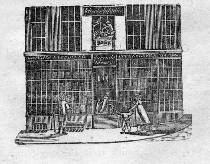 In the 1805 engraving, prominent window displays of books and maps on either side of the door attract the attention of the ...