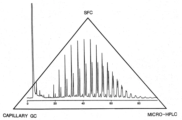Fig. 1 Chromatography triangle of capillary GC, capillary SFC, and micro-HPLC. The figure depicted the high resolution capability of the microbore column chromatography. A unified approach to chromatography for the application sample domain of GC, SFC, and HPLC. Chromatogram of the separation of a polyglycol with an average molecular weight of 1800 (chromatogram courtesy of B. E. Richter, Lee Scientific).