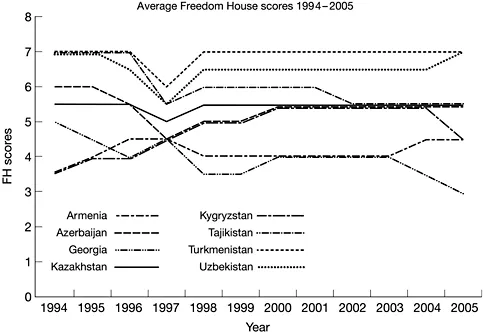 Going beyond idiosyncratic analyses of the political transitions in Central Eurasia with the goal of developing general theories requires us to classify Central Eurasia’s regimes in different categories. Thereafter, we should not only systematically compare analytical groups but also the individual cases within each group, highlighting differences among otherwise similar countries (Sartori 1970). An analysis of Freedom House’s Freedom in the World Index (Freedom House, various years) allows for a broad distinction between stable authoritarian regimes (“not free” according to Freedom House) and those that have been hybrid regimes (“partly free”) either throughout or at least most of the post-Soviet period. The first group consists of Turkmenistan, Uzbekistan, Kazakhstan, and Tajikistan. Georgia, Armenia, Kyrgyzstan, and Azerbaijan belong to the second group (Figure 1.1).