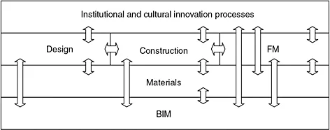 An awareness that the built environment design, construction and facilities management industry was lacking in the levels of productivity, competitiveness and innovation apparent in other industrial sectors has led to a series of initiatives by the Australian government and industry seeking to identify how technology, product and process innovation in the IT, materials, design, construction and facilities management domains can be more successfully identified, diffused and implemented within an architecture, engineering, construction and operations (AECO) organization (again, see Figure 1.1).